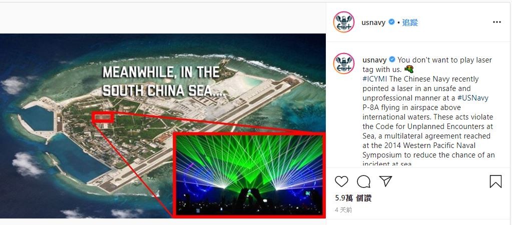美國海軍近日在官方IG貼出一張中國南海島嶼的照片,並寫道:「你不會想跟我們玩雷射槍大戰的。」似乎是針對先前「P-8海神式海上巡邏機在飛行途中,遭中共解放軍的海軍驅逐艦『呼和浩特號』投射軍事級雷射」一事作出回應。這篇貼文是否意味美國海軍即將祭出新的反制措施,目前仍無法得知。