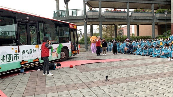 由桃園及中壢監理站結合桃園市政府交通局、交通警察大隊共同舉辦的「大型車視野死角與內輪差」交通安全教育,4日由黃萬益所長帶領公路總局的吉祥物「一路、平安」、假人「大明」及出動大客車到桃園武漢國中舉行,約有學生、教職員300多人參加,採互動體驗方式宣導,讓學生印象深刻。