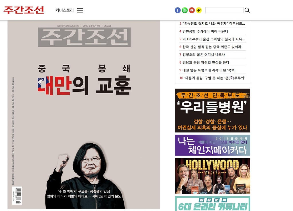 1968年創刊的《週刊朝鮮》,日前發行的第2597號週刊以緊握拳頭的蔡總統為封面,並下標「封鎖中國─借鏡台灣」,透過封面故事詳細介紹台灣這段時間以來的防疫政策,在官網上的內容介紹,以「對中貿易額近似於韓國,防疫政策卻完全相反」做為引言。