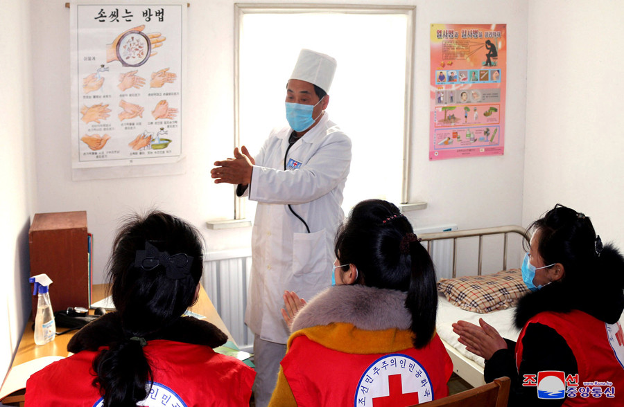 ▲ 北韓防疫人員宣導正確的洗手方式。(圖/朝中社)