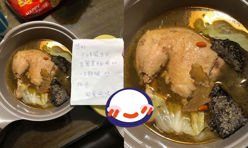 這位女網友文中表示,她點外送的時候,明明只訂了一碗「麻油米血高麗菜湯」,拿到的時候卻發現很大包,「想說怎麼這麼大包~發現多了一支大雞腿~之後在袋子看到紙條~原來是老闆生日大放送耶!」只見紙條上用娟秀字跡寫著「您好:今日老闆生日,高麗菜米血湯加一支雞腿 ^_^ 祝您 用餐愉快」,署名則是店家的名稱。