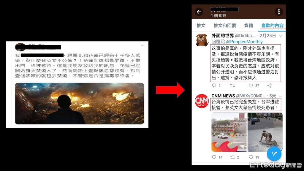 ▲大陸網軍透過推特帳號發布不實假疫情,警方籲勿轉傳以免觸法。(圖/記者張君豪翻攝)