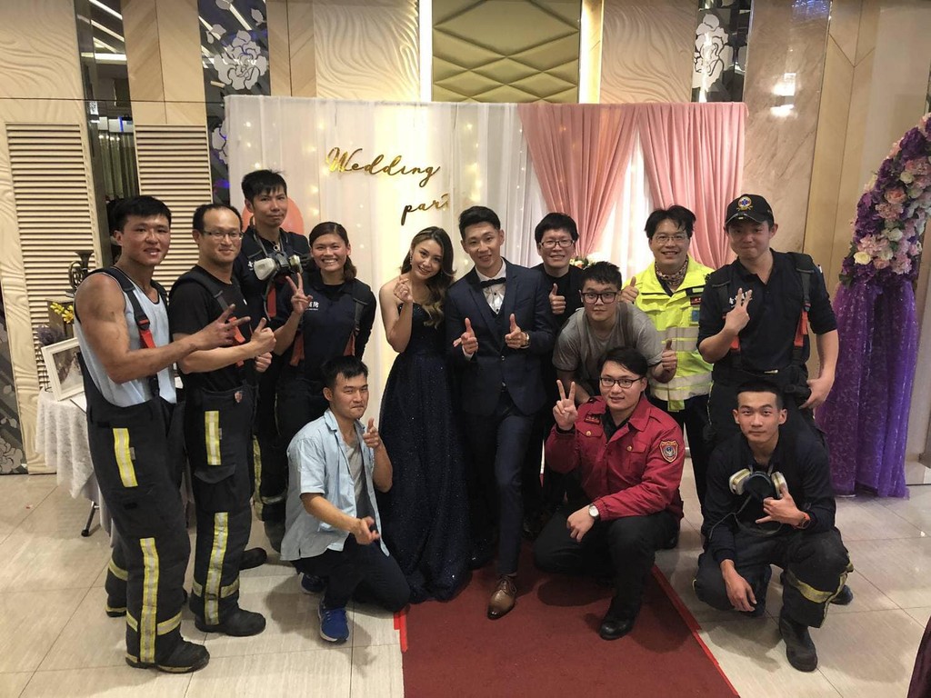 在婚禮散場時,分隊長帶著剛打完火警的弟兄趕回婚宴向陳俊吉夫妻致意,讓所有現場還未離開的賓客與攝影師見識到充滿「消防魂」的祝福方式,留下深刻的回憶。