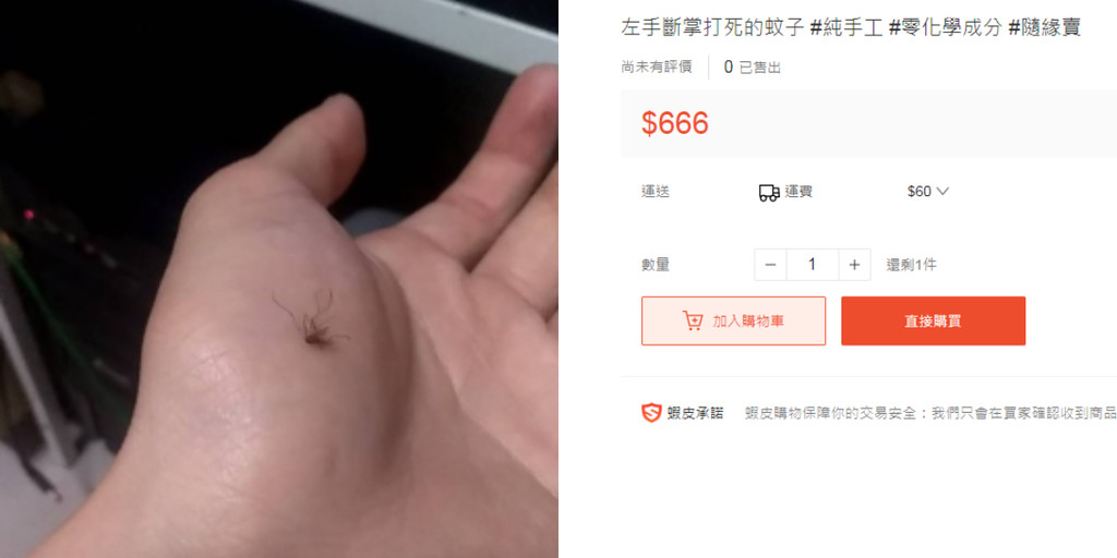 至於一隻要價666元的蚊屍,賣家表示,「左手斷掌打死的蚊子,純手工、零化學成分、隨緣賣」、「不小心打死的蚊子,屍體健全,翅膀還在」,簡直令人大開眼界,不過至今銷量仍掛蛋。