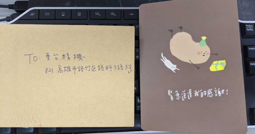 東台精機收到民眾寄來的感謝卡片上,全文親筆書寫著「致東台精機經營者及全體員工」,內容寫到「感謝根留台灣,日夜趕工生產口罩,守護國人健康。」文尾寫著「謝謝」,還畫上一顆大心。卡片上的圖案的OS還說著「哎您,你怎麼這麼好。」