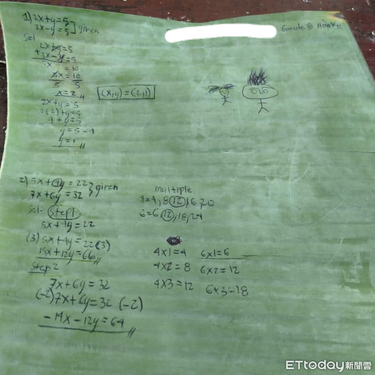 這所學校位在菲律賓的南蘇里高省(Surigao del Sur),男孩的老師( Arcilyn Balbin Azarcon Lpt)把他的筆記PO上FB,驕傲秀出學生的聰明與勤奮。蒙特巧妙的運用香蕉葉上的莖纖維,平行的就像筆記紙上的格線,他用鉛筆在葉子上寫下密密麻麻的數學方程式,還在空白處畫上火柴人圖案,十分可愛!