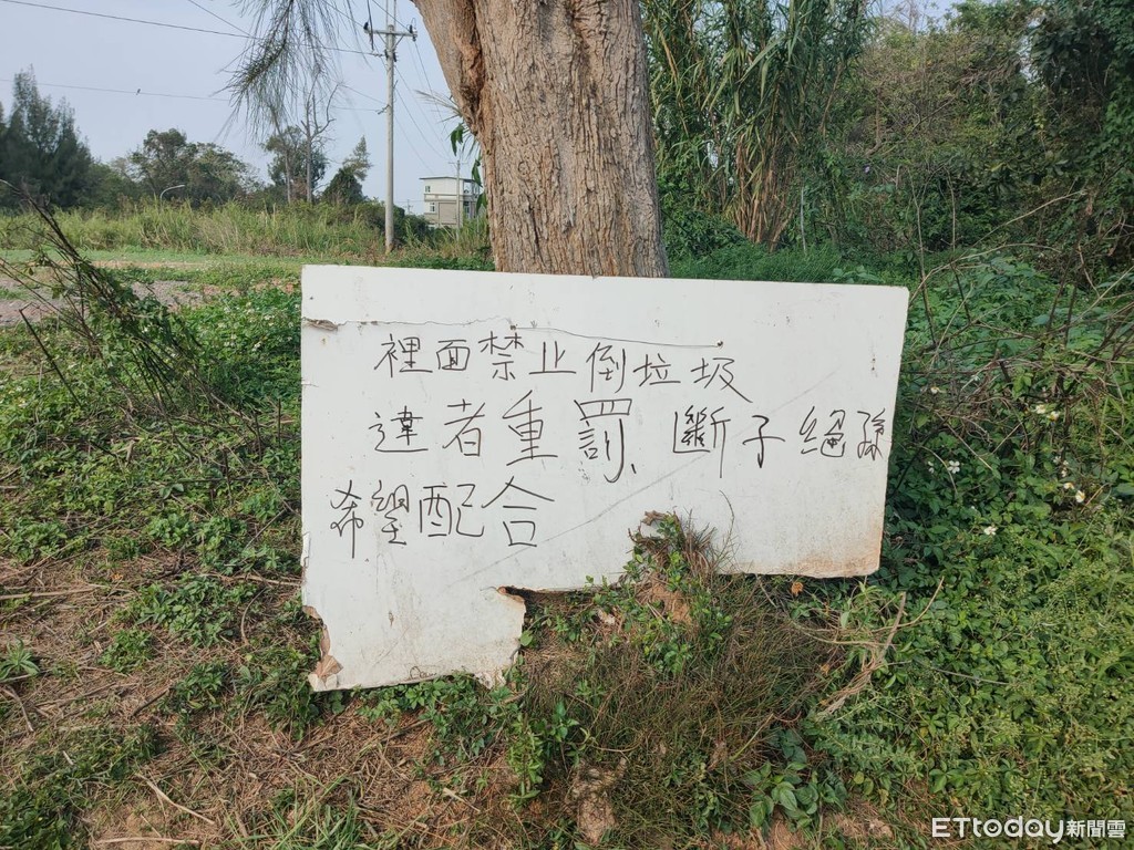 ▲金門山區被人亂丟棄動物遺體垃圾,居民貼公告怒罵:斷子斷孫 。(圖/記者葉小金攝)