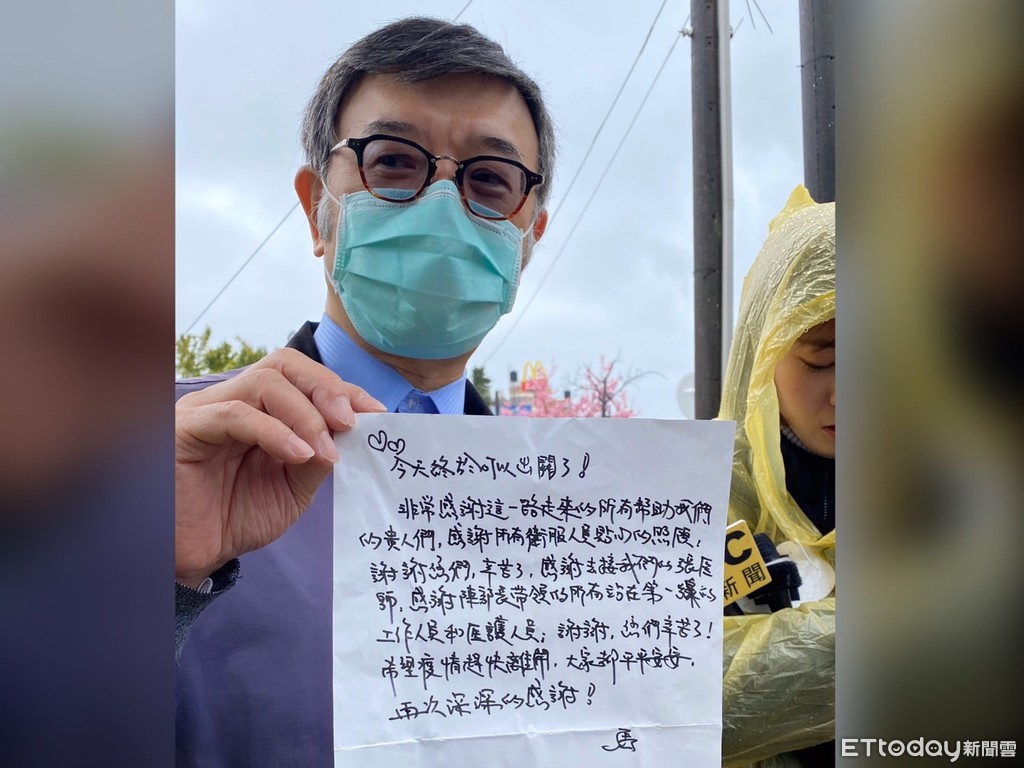 如今,14天過去,母子2人10日凌晨解禁,在經過簡單的體溫測量,確定沒有發燒及其他症狀後,已由親友接送返回高雄。此外,2人也親手寫下感謝信,感謝各方的幫助,「非常感謝一路走來所有幫助我們的貴人們,感謝所有衛福人員貼心的照顧!」