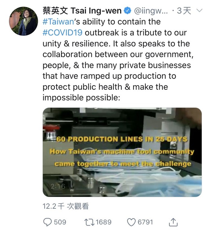 ▲蔡英文推特宣傳口罩政策。(圖/翻攝蔡英文推特)