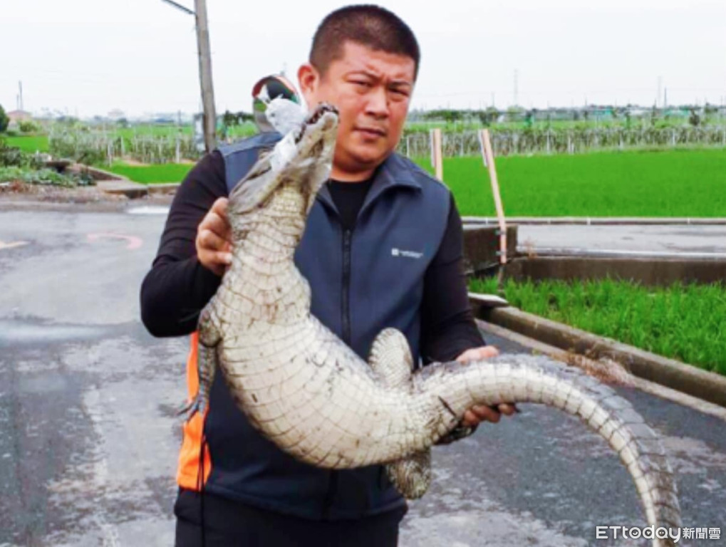 ▲江厝里長沈永清說,他是第一次接到這種鱷魚逛大街的民眾陳情案件,當下他偕同義消廖國志,前往江厝里新厝仔土地公廟前的農田,果不其然就看見真有條鱷魚在溝渠中。(圖/翻攝自Facebook/胡克勤)