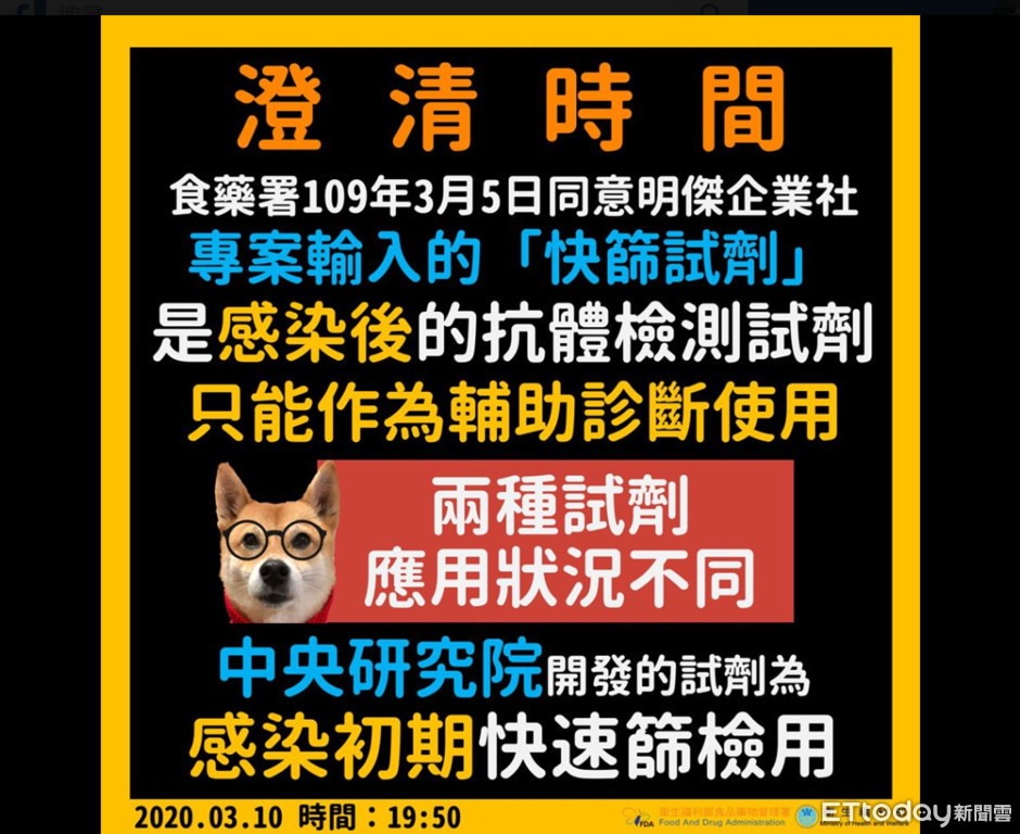衛福部發指出,食藥署 109 年 3 月 5 日同意明傑企業社專案輸入的「快篩試劑」;中研院開發的試劑:是感染初期快速篩檢用,兩種試劑應用狀況。