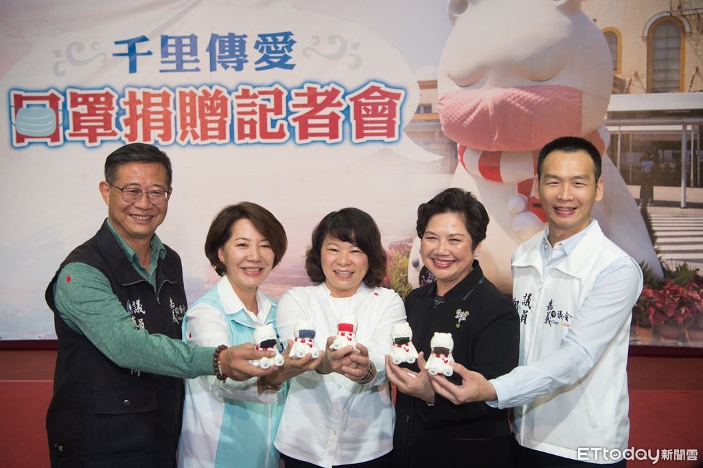 ▲溫玉霞立委捐贈口罩回饋嘉鄉,市長貴賓與公仔合拍。(圖/記者翁伊森翻攝)