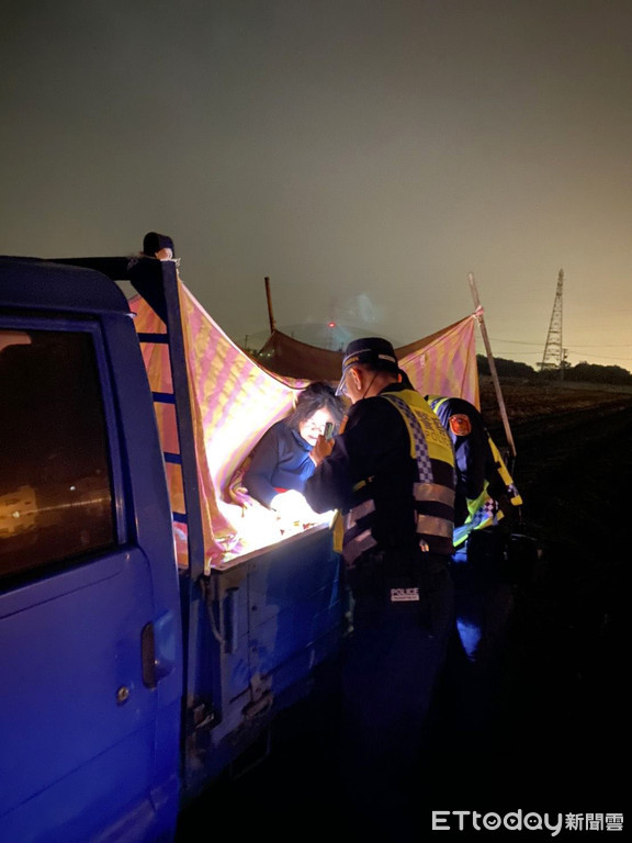 ▲▼橋頭派出所員警全程保護老農到蒜頭園,發現老農妻子架起蚊帳睡在蒜頭園邊發財車車斗上,所長等人告知近期都會協助巡邏,並會同許婦將老農護送返家。(圖/記者蔡佩旻翻攝)