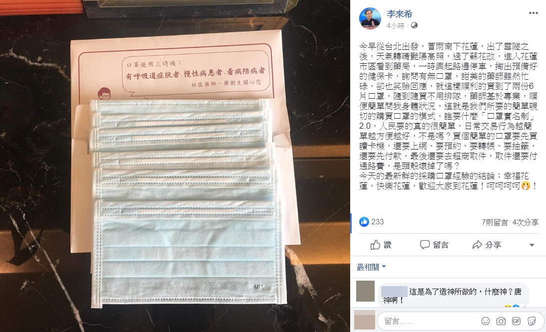 李來希13日在臉書上PO出買到口罩的照片,他表示,今早從台北出發,冒雨南下花蓮,出了雪隧之後,天氣轉晴艷陽高照,過了蘇花改,進入花蓮市區看到藥局,一時興起路邊停車,掏出預備好的健保卡,詢問有無口罩?甜美的藥師雖然忙碌,卻也笑臉回應,就這樣順利的買到了兩份6片口罩,隨到隨買不用排隊。