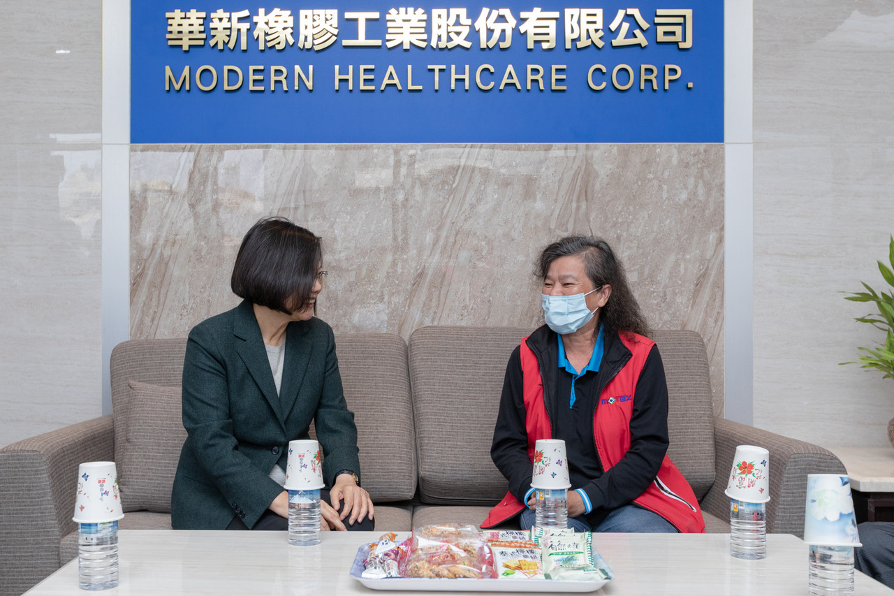 蔡英文抵達後,先在「華新創意生活館口罩觀光工廠」董事長鄭永柱的陪同下,前往探望日前因趕製口罩、手指不慎被機器截斷的女員工。女員工說,受傷之後,大家都非常關心她,還有許多人寄送營養品,讓她感受到台灣是個處處充滿人情味的地方,也相當感激。