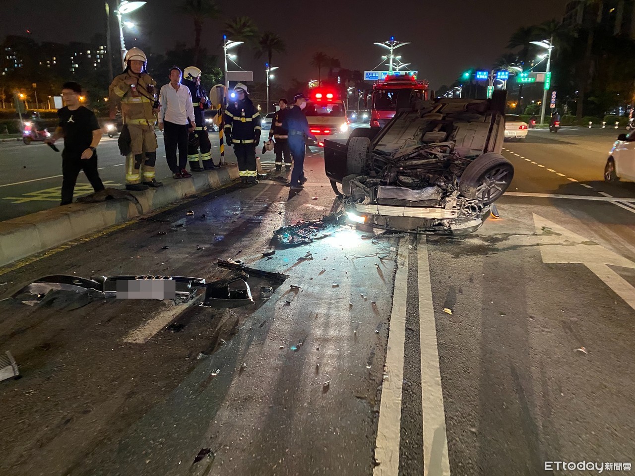 高雄中山路、鎮海路口13日晚間發生一起離奇自撞車禍,一輛黑色奧迪轎車疑似自撞分隔島後翻覆,整輛車四腳朝天躺在路中,現場零件四散,一片狼藉。警消獲報趕抵現場,卻發現駕駛消失無蹤,當場傻眼。
