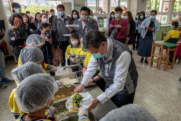 ▲鄭文燦打菜時一句「打菜同學都有戴帽套、口罩和手套吧?」立被後方小二女學童糾正「市長,不能講話!」。(圖/市府提供)