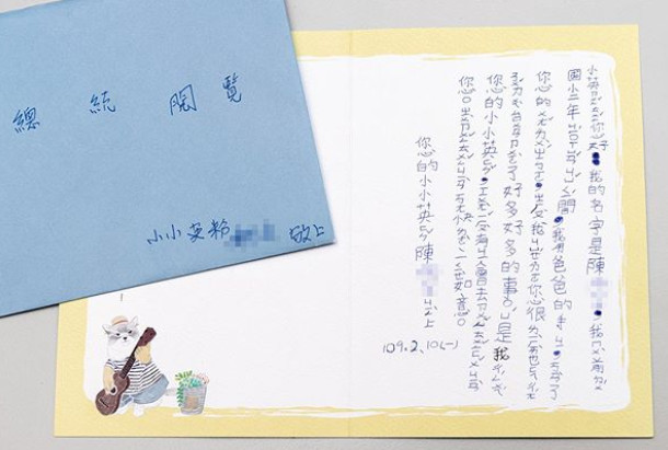 蔡英文PO出兩張照片,並表示,最近收到一位小朋友寫的信,是一位就讀國小的小小英粉,特別寄信來請她簽書。信中寫道,「小英總統您好,我的名字是陳XX,我目前讀國小二年級,選舉期間,我用爸爸的手機,看了您的網路直播,之後我覺得您很厲害,也非常努力,為台灣做了好多的事,於是我成為您的小小英粉,希望以後有機會去總統府見您。祝總統健康快樂,一切如意。您的小小英粉敬上」