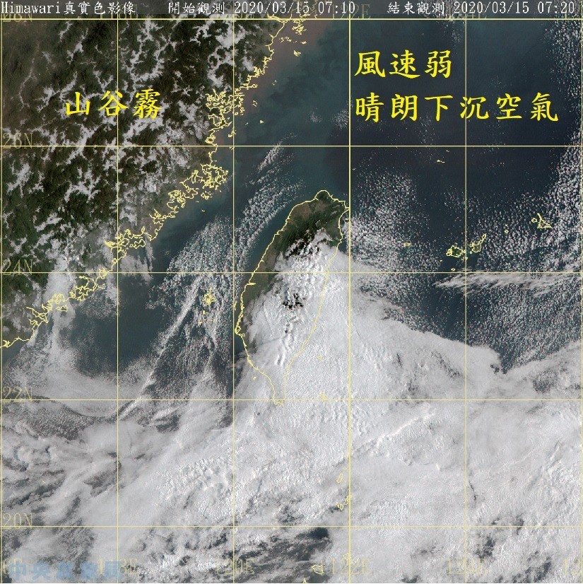 鄭明典今在臉書PO出衛星雲圖說明,台灣北方雲散了,可以說乾冷空氣到了,不只這樣,仔細看,海面稀疏雲點移動緩慢,環繞的中心距離台灣很近,所以是分裂高壓從接近台灣北端位置出海。他也說,大陸山區出現珊瑚狀的「谷霧」,那也是冷空氣滯留的跡象,也是說明有分裂冷高壓在附近。