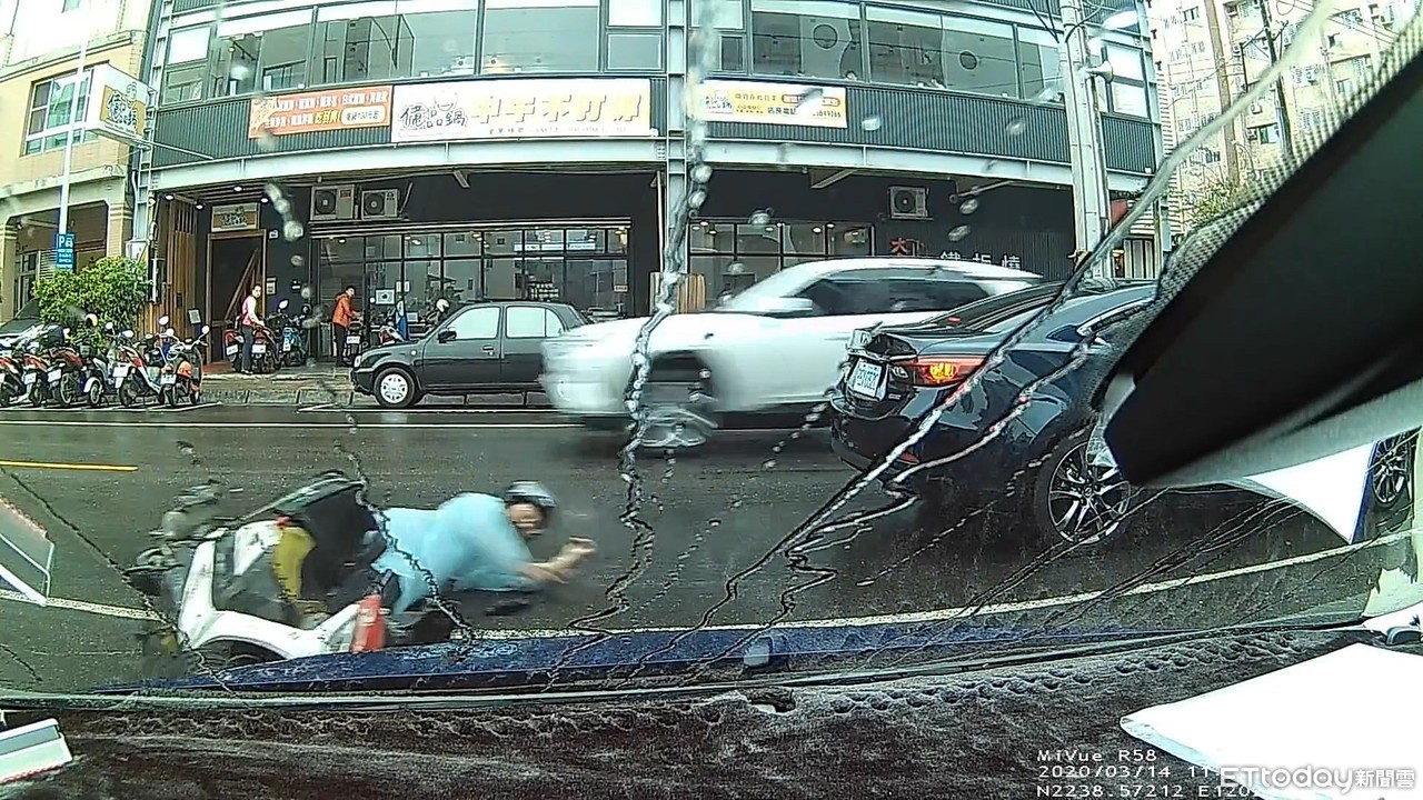 ▲外送騎士因閃避路邊駛出的自小客自摔。(圖/記者洪正達翻攝)