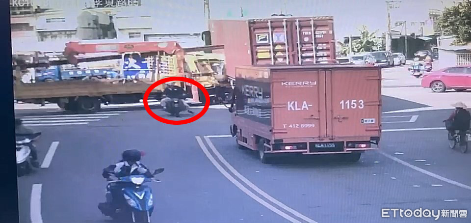 ▲騎士阿北快速閃避肇事大貨車逃死劫。(圖/記者洪正達翻攝)
