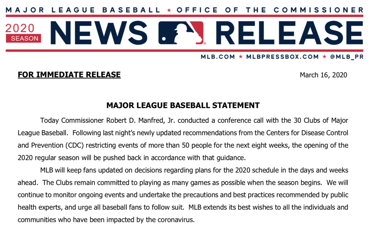 MLB官方在臉書上張貼最新公告指出,大聯盟專員曼佛瑞(Rob Manfred)17日召集30個隊伍進行會議,根據美國疾病管制與預防中心(CDC)最新的建議──防疫指南15天試用版,未來8周,50人或以上的聚會應該停止,因此MLB最新決定為遵循指南「延遲開賽」。