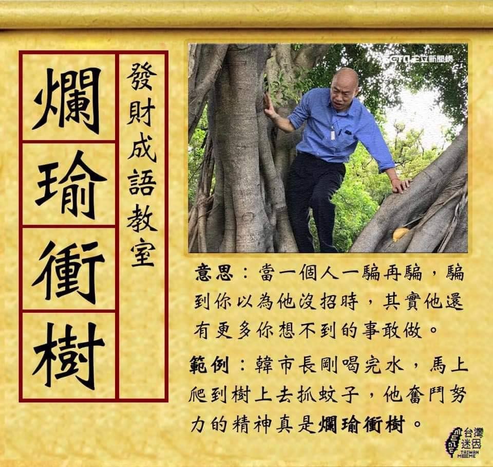 ▲韓國瑜選前爬樹引來各界褒貶不一的評價,日前有韓粉跳出來護航時飆罵反韓人士三字經,確定挨罰8千元。(圖/ETtoday資料照)