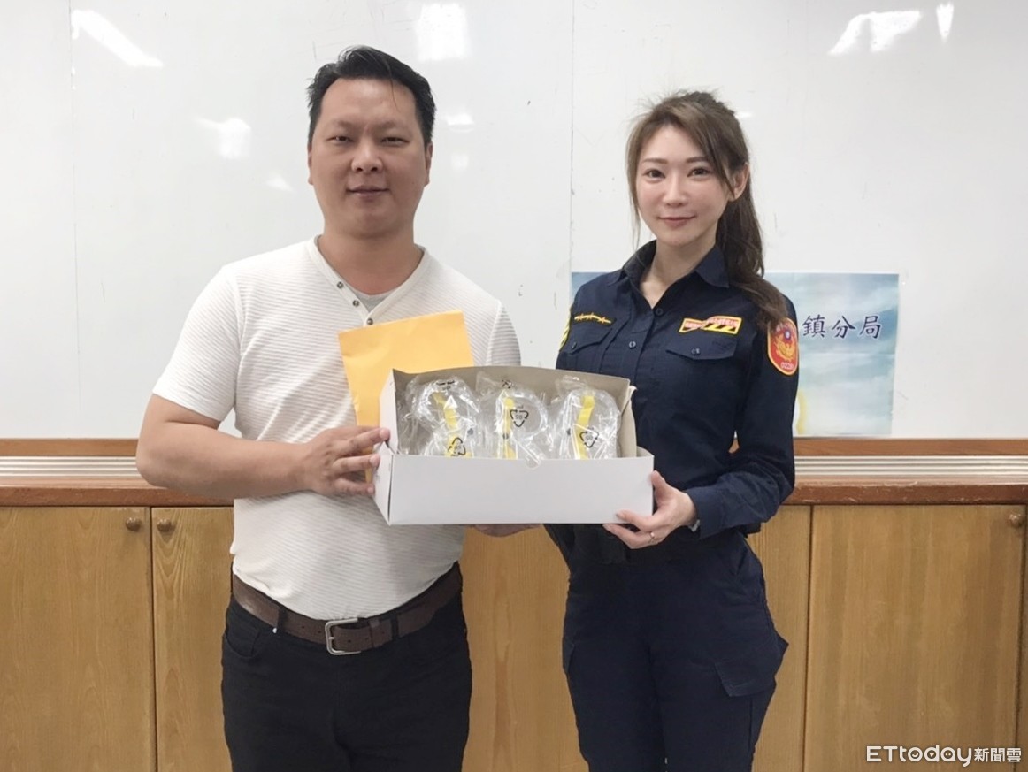 ▲桃園市義交大隊17日帶著防疫物資捐贈平鎮分局,由交通分隊正妹女警林筱綺代表受贈。(圖/記者沈繼昌翻攝)