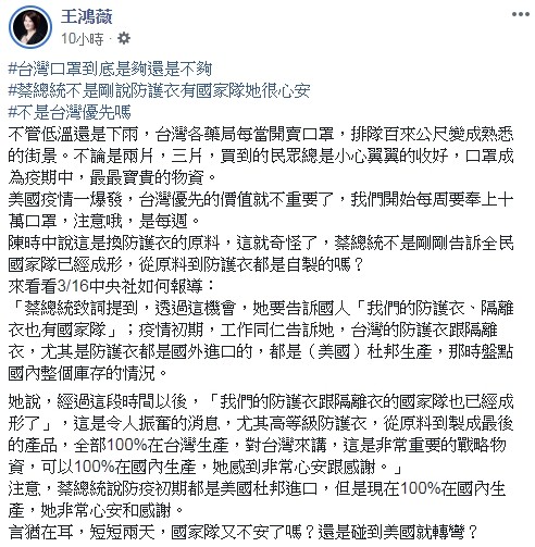 王鴻薇還指,「她(蔡英文)說,經過這段時間以後,『我們的防護衣跟隔離衣的國家隊也已經成形了,這是令人振奮的消息,尤其高等級防護衣,從原料到製成最後的產品,全部100%在台灣生產,對台灣來講,這是非常重要的戰略物資,可以100%在國內生產,她感到非常心安跟感謝。』」