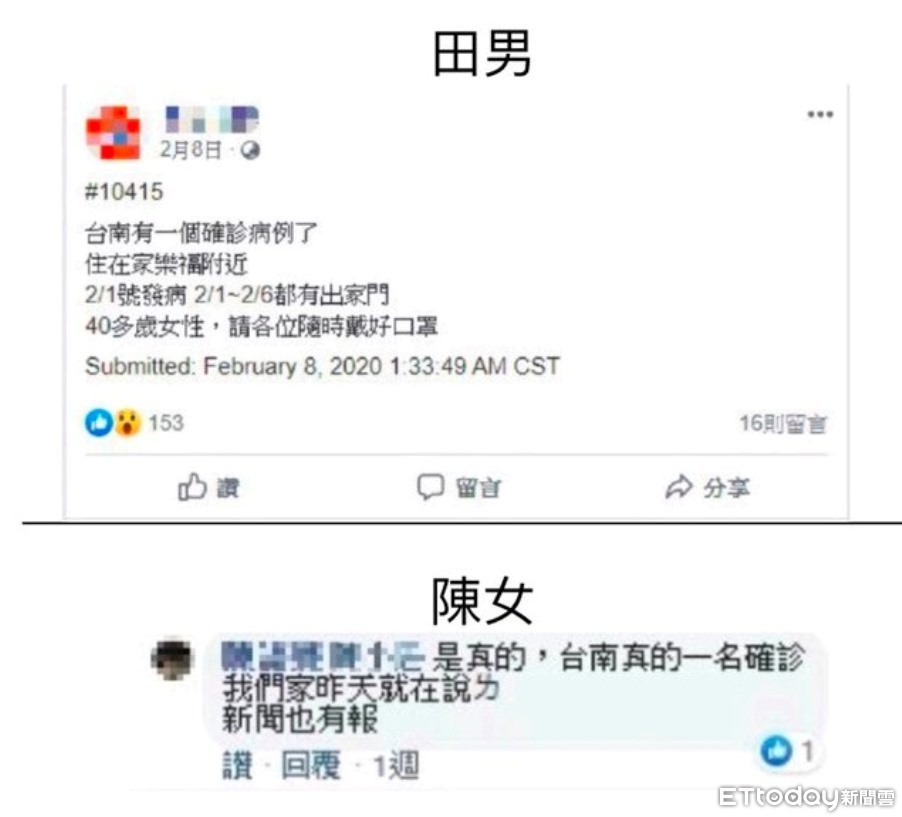 民眾指出,該臉書粉專貼文「台南已經有一個確診病例了,住在家樂福附近,40多歲女性,請各位戴好口罩」,並有網友留言回覆,「是真的,台南真的有一名確診,我們家昨天就在說了」等,經衛生主管機關認定為不實訊息言論,台南市警刑大科技犯罪偵查隊循線追查,通知粉專管理員田男及網友陳女到案說明,2人均坦承未查證內容真偽就貼文,並稱不知該行為已觸法。