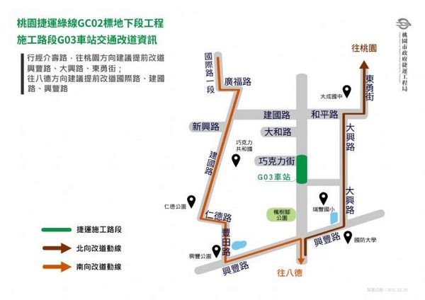 捷運局20日指出,捷運綠線GC02標地下段工程自去(2019)年10月起,已陸續於桃園區介壽路及八德區介壽路一、二段進行地質鑽探、地下管線試挖、建物現況調查及公車站牌移設會勘等前置作業,預定於2020年3月23日至8月23日期間,進行第一階段G03車站的連續壁施工作業。