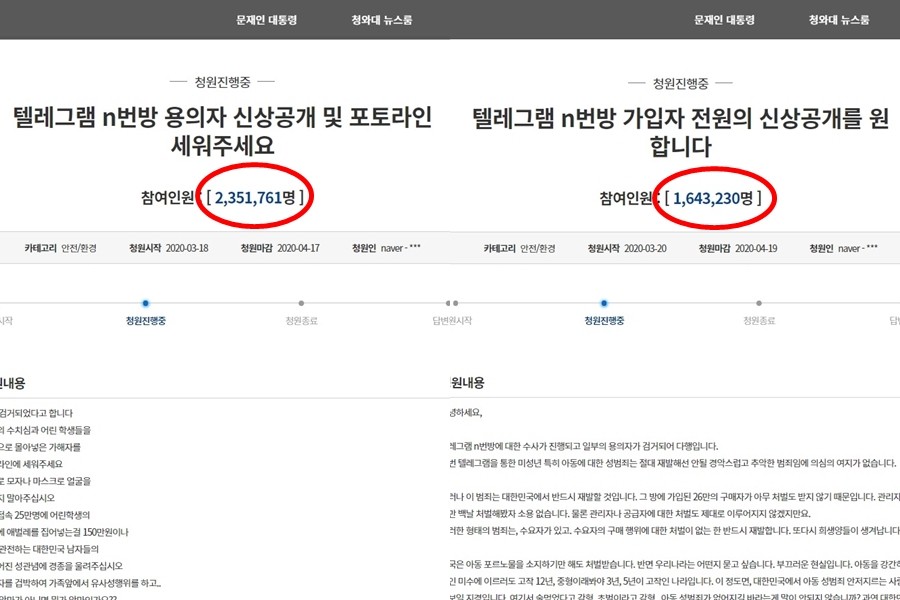 ▲ N號房2起請願案都有百萬人連署。(圖/台灣時間下午5時55分翻攝自青瓦台網站)