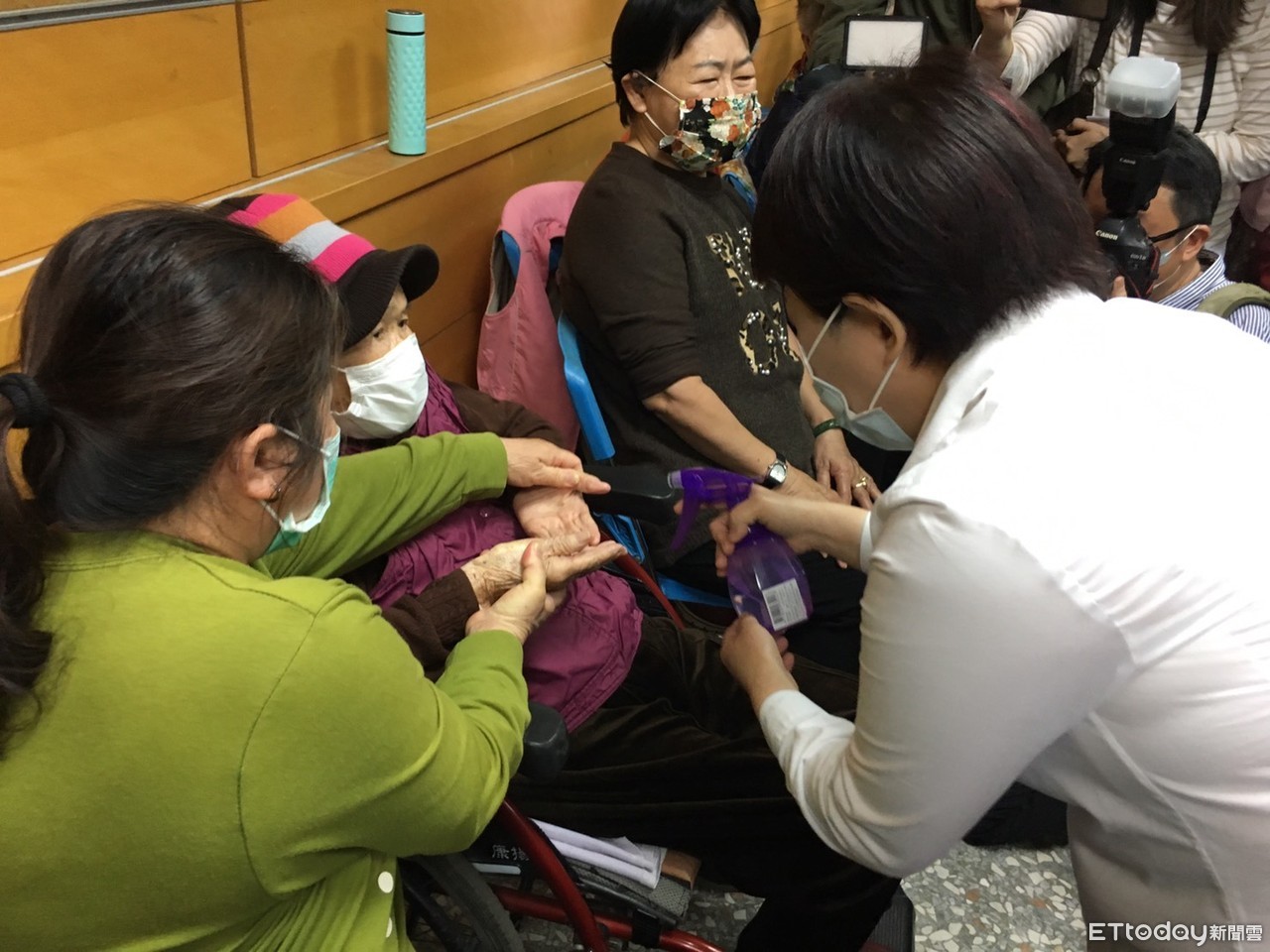 ▲盧秀燕日前訪視關懷據點,幫長輩噴洗手液。(圖/記者鄧木卿攝)