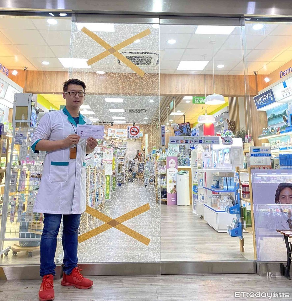 ▲台南市北區樂森藥局的玻璃大門,就被急著購買口罩的民眾給撞破,幸好無人員受傷,戴彰延藥師表示,理解民眾心情,損失自行吸收不追究,並強化警示。(圖/記者林悅翻攝,下同)