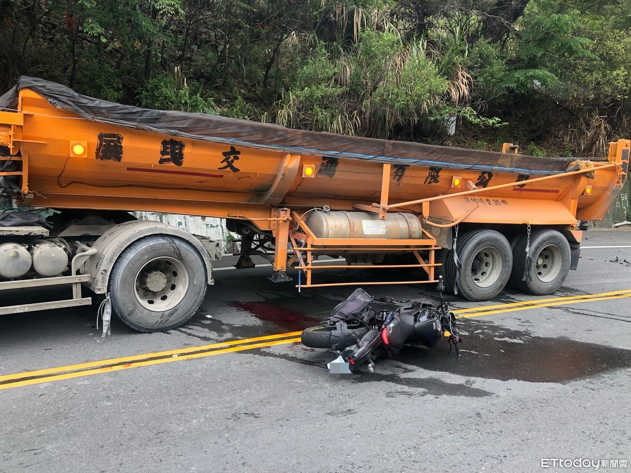 ▲葉男直接撞上對向車道的砂石車左側車身,人車被捲入車底。(圖/記者白珈陽翻攝)