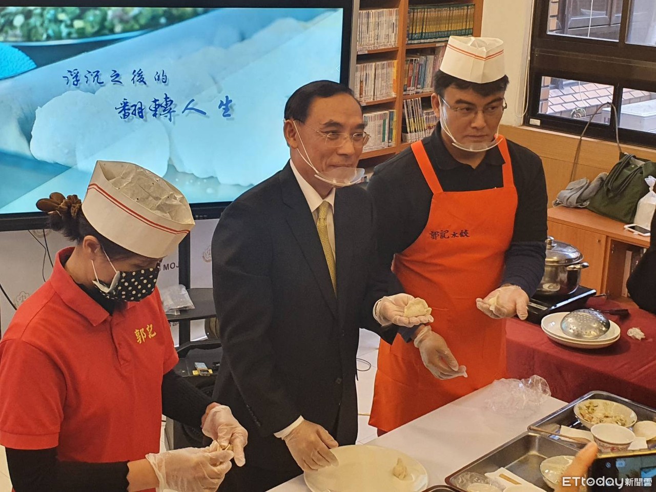 ▲桃園「郭記健康水餃店老板」郭珈瑋,從在車庫裡賣餃子到目前開設實體店面,背後有滿滿愛的力量支持 ,法務部長蔡清祥到店學包水餃。(圖/記者陳崑福翻攝)