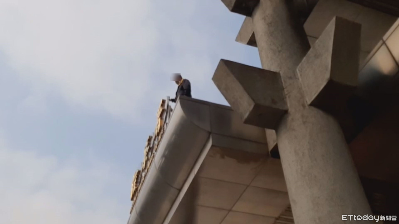 ▲男子爬上苗栗地檢署2樓平台上,情緒激動揚言要跳樓,警消人員不敢大意,僵持了30分鐘才將他制伏。(圖/記者黃孟珍翻攝)