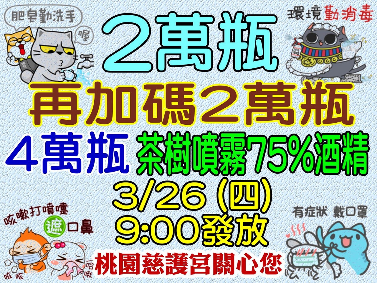 桃園市頗負盛名的慈護宮日前在臉書預告將於26日上午9時發放4萬瓶茶樹噴霧75%酒精,桃園市長鄭文燦24日在防疫專案會議表示,此舉已違反防疫規定,應該明文禁止,廟方1次性發送4萬瓶恐釀群聚風險,請廟方分天分批或改採其他方式發送;慈護宮主委吳正宗說,會再與市府討論如何發送,原則上會慢慢發或分批發,或請里長協助發送。