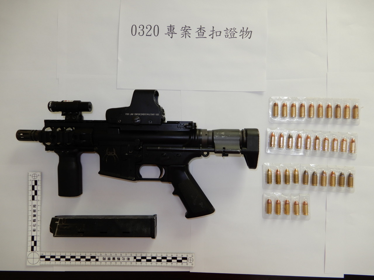 ▲彰化縣警局掃黑逮捕幫派首腦還搜出衝鋒槍及大批子彈。(圖/彰化縣警察局提供)