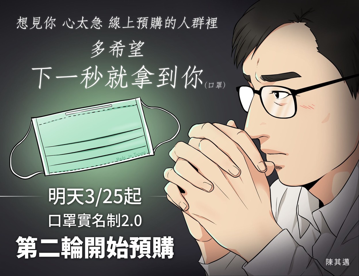 陳其邁透過臉書趣味「開唱」,「想見你,心太急,線上預購的人群裡,多希望,下一秒就拿到你。」他提醒大家,明天起口罩實名制2.0第二輪開始預購,規則和上次一樣,但縮短了大家可以拿到口罩的時間,這週預購、下週就可以拿到。