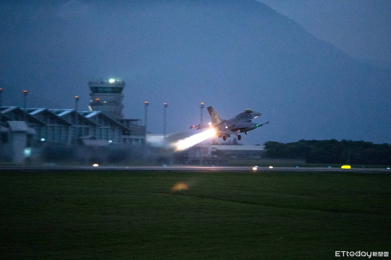 ▲空軍第五戰術混合聯隊F-16戰鬥機於清晨5點30分緊急升空,實施防空攔截演練。(圖/國防部提供)