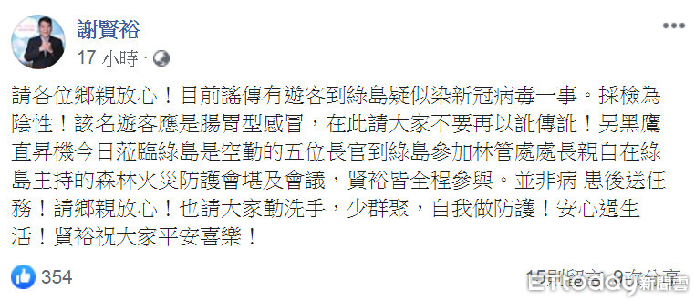新冠肺炎疫情不減,民眾人心惶惶,25日在台東離島的綠島鄉傳出遊客疑似感染新冠肺炎,綠島鄉長謝賢裕特於臉書PO文澄清,該遊客是腸胃型感冒,採檢結果為陰性,請大家勿以訛傳訛。