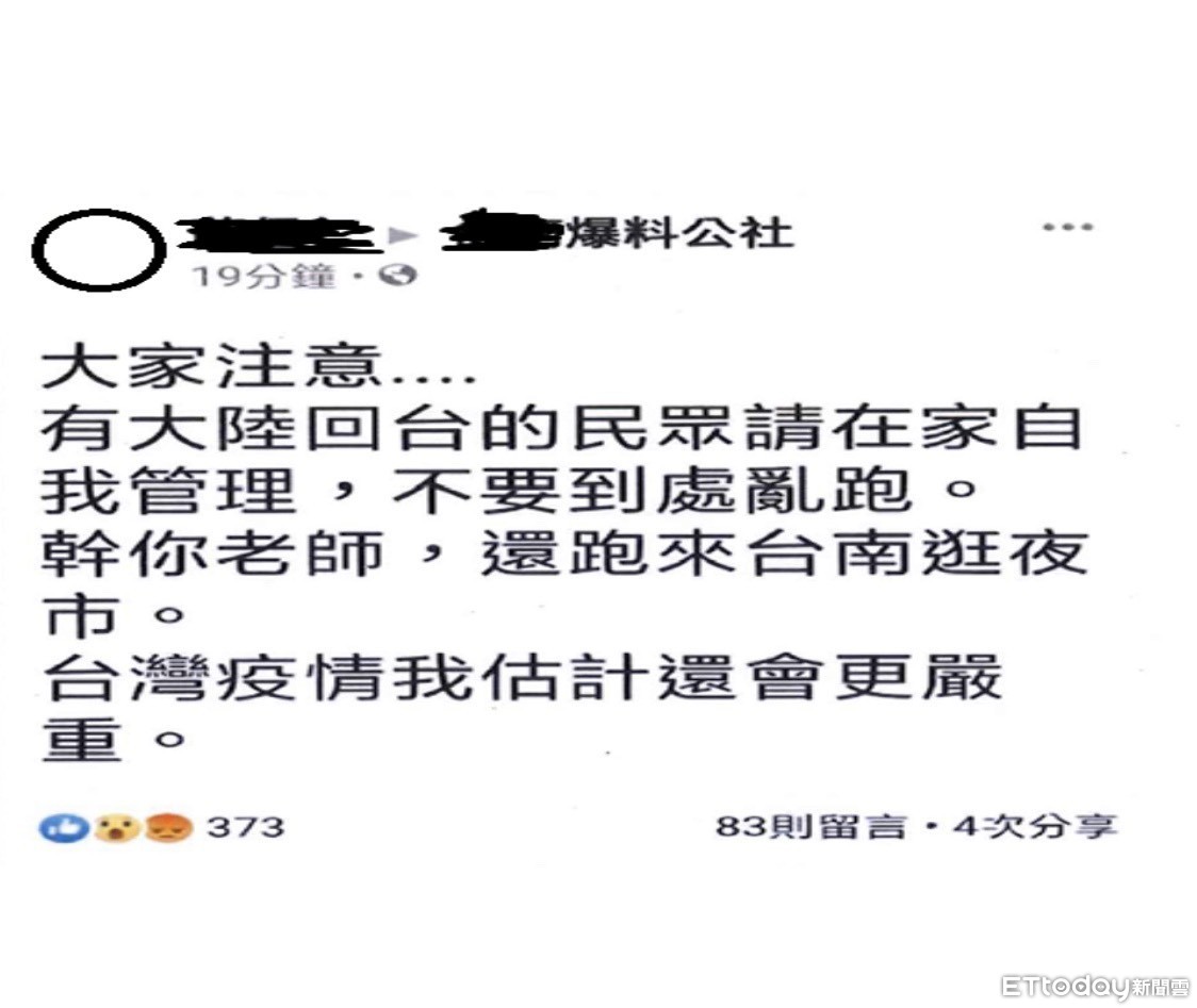 另臉書帳號「薛○○」在社員達12萬人之臉書社團「○○爆料公社」內公然發文:「大家注意…有大陸回台的民眾請在家自我管理,不要到處亂跑。幹你老師,還跑來台南逛夜市。台灣疫情我估計還會更嚴重。」等未經查證之謠言及不實訊息,企圖影響政府防疫作為,造成民眾恐慌。