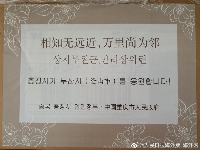 《海外網》報導,釜山市政府26日表示,1月份中國新冠病毒疫情嚴峻時,曾向重慶支援醫療用品,當中包含1萬個口罩、3000副醫用手套和500副護目鏡。重慶最近則向釜山回贈口罩,箱子上寫著詩句「相知無遠近,萬里尚為鄰」,並用韓文寫上「重慶市為釜山市加油!」