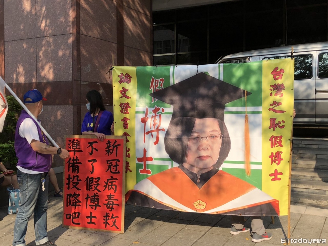 支持者們舉著紅底黑字的標語,「新冠病毒救不了假博士,準備投降吧」,還有一大面民進黨旗幟,上頭印了蔡英文穿學士服的樣子,並配上諷刺的文字,痛批她「台灣之恥」、「假博士」等語,同時也不斷呼口號,「總統假不了,假的真不了!」「博士證書拿來看,博士論文拿出來!」甚至希望全台2300萬人每天對蔡英文吼,每天叫她出來!