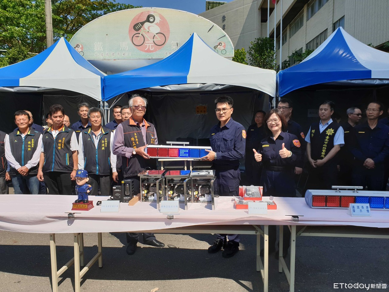 ▲台南佳里金唐殿管理委員會,捐贈「移動型監控設備」、「GPS導航定位系統」、「360度環景攝影機」及「直流長排警示燈」、「LED路檢汽機車分流指示牌」、「舉發單皮夾」等警用交通標式裝備給佳里分局。(圖/記者林悅翻攝,下同)