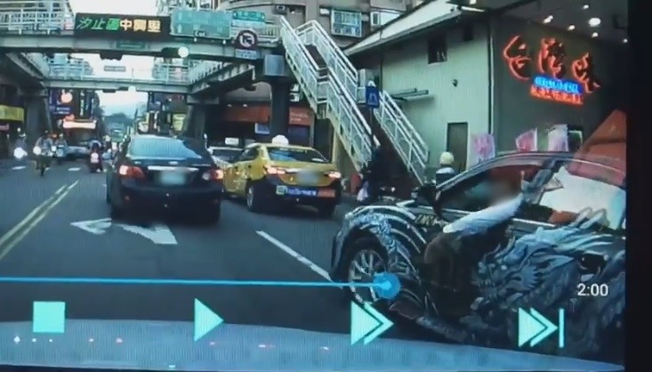 行車紀錄器畫面錄下,當時原PO太太駕車行經中興路與福德一路口正在停等紅燈,不料右側卻突然竄出一輛車尾印有「爆龍連合」字樣的黑色改裝車,不斷逼近試圖切入插隊,眼見原PO太太並無意相讓,還一度後退、前進想硬切,甚至搖下車窗轉頭凝視;待綠燈前車開始移動後,改裝車旋即迅速切出,駕駛還將手伸出車窗揮了揮,最後右轉駛進福德一路揚長離去。