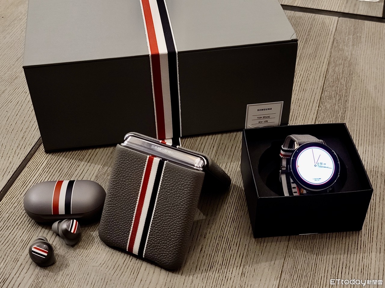 值得注意的是,如果要購買Galaxy Z Flip x Thom Browne聯名款,那麼就得一次入手「一整組」;在盒裝當中,除了手機之外,還包含了聯名款的Galaxy Buds+藍牙耳機與Galaxy Watch Active2智慧錶。