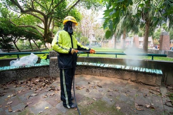 桃園市防疫消毒大隊共有124名隊員、33台消毒車以及58部背負式的消毒機,未來也將陸續安排全市環境消毒作業。