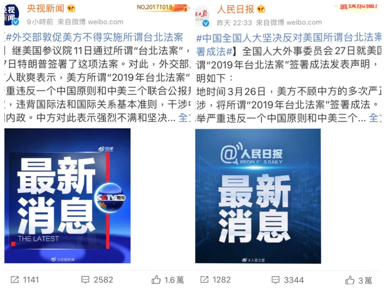 ▲陸官媒央視及人民日報發文批美通過台北法案。(圖/翻攝微博)